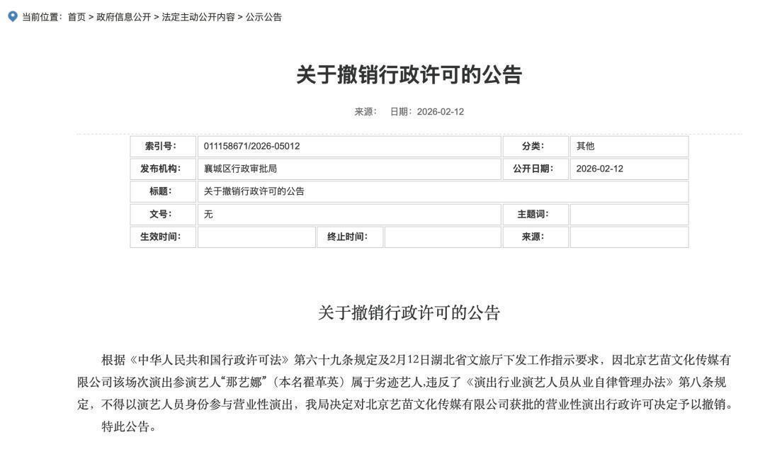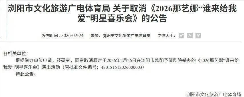 那艺娜小红书账号显示已被禁言。两地取消那艺娜演唱会2月12日,湖北襄阳市襄城区行政审批局发布《关于撤销行政许可的公告》引发关注。公告显示:根据《中华人民共和国行政许可法》第六十九条规定及2月12日湖北省文旅厅下发工作指示要求,因北京艺苗文化传媒有限公司该场次演出参演艺人“那艺娜”(本名翟革英)属于劣迹艺人,违反了《演出行业演艺人员从业自律管理办法》第八条规定,不得以演艺人员身份参与营业性演出,我局决定对北京艺苗文化传媒有限公司获批的营业性演出行政许可决定予以撤销。大皖新闻记者注意到,2月24日,湖南省浏阳市文化旅游广电体育局发布了一则《关于取消<2026那艺娜“谁来给我爱”明星喜乐会>的公告》。公告称,根据举办单位申请,经研究,同意取消原定于2026年2月26日在浏阳市欧阳予倩剧院举办的《2026那艺娜“谁来给我爱”明星喜乐会》演出活动。2月25日,大皖新闻记者联系上了浏阳市文化旅游广电体育局。工作人员表示,系演出举办单位北京艺苗文化传媒有限公司先提出取消申请。那么,取消演出是否与那艺娜被举报涉嫌偷税漏税有关?该工作人员称,因为那艺娜存在劣迹行为。